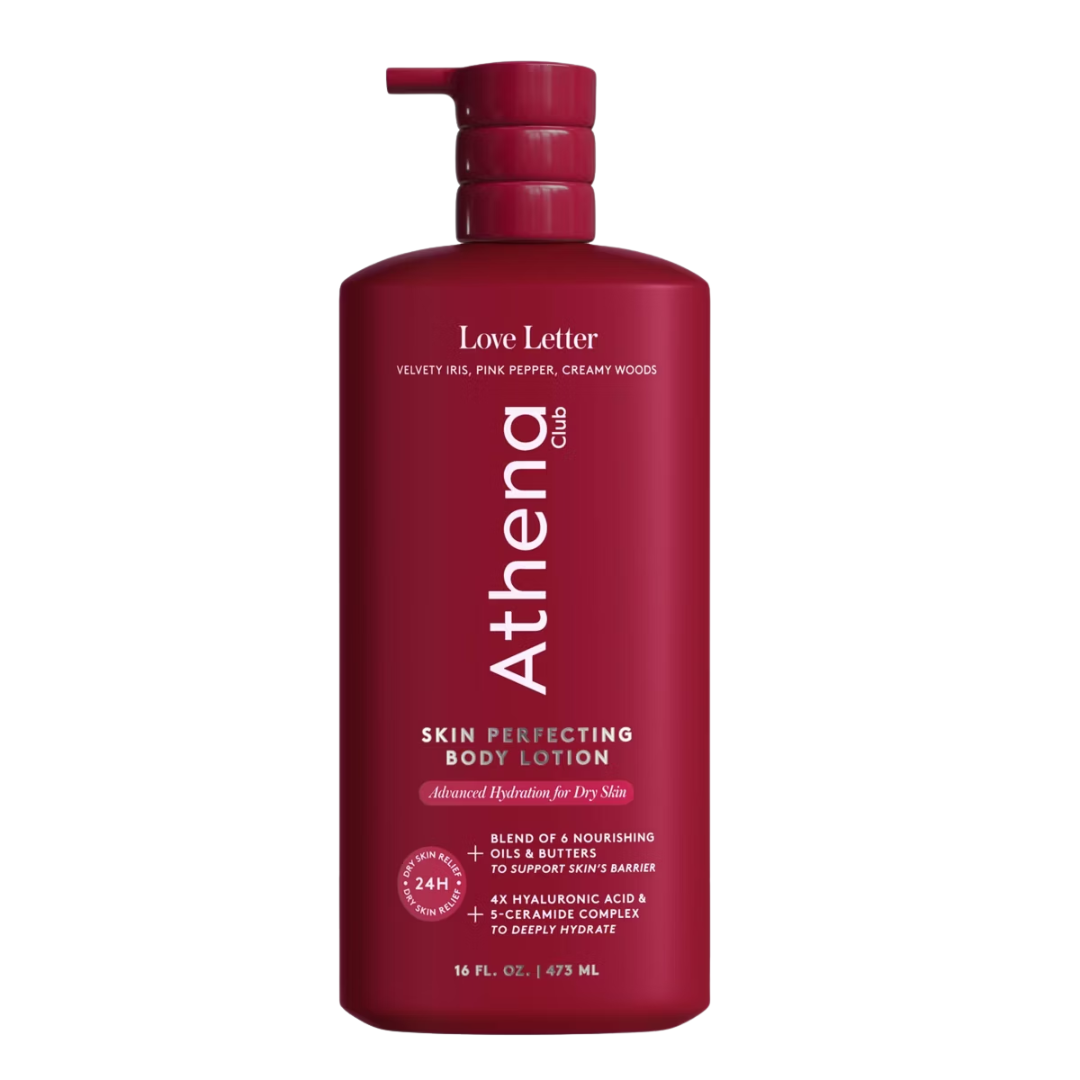 Athena Club Skin Perfecting Body Lotion in Love Letter is a lightweight, fast-absorbing moisturiser designed to deeply hydrate while improving skin smoothness and radiance. Powered by a multi-layer moisture complex with four types of hyaluronic acid, five barrier-strengthening ceramides, and nourishing oils such as avocado and sunflower, the formula helps lock in moisture and support a healthy skin barrier. Peptides and niacinamide work to enhance skin texture, leaving it soft, plump, and comfortable throughout the day. The romantic Love Letter fragrance features notes of spiced pink pepper, amber, musk, and creamy woods, creating a warm, softly sensual scent that lingers subtly on the skin.