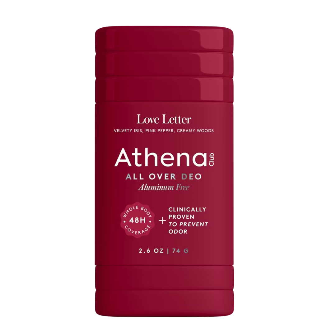 Athena Club All Over Deodorant Stick in Love Letter is a gentle, aluminum-free deodorant designed to provide long-lasting odor protection wherever you need it. The clear, smooth-glide formula is clinically proven to deliver up to 48-hour odor control while remaining suitable for sensitive areas such as underarms, thighs, underboob, and feet. It uses moisture-absorbing minerals and skin-friendly ingredients to help neutralize odor-causing bacteria while keeping skin dry and comfortable throughout the day. The Love Letter fragrance features warm notes of pink pepper, amber, musk, and creamy woods, creating a soft, romantic scent that lingers subtly on the skin.