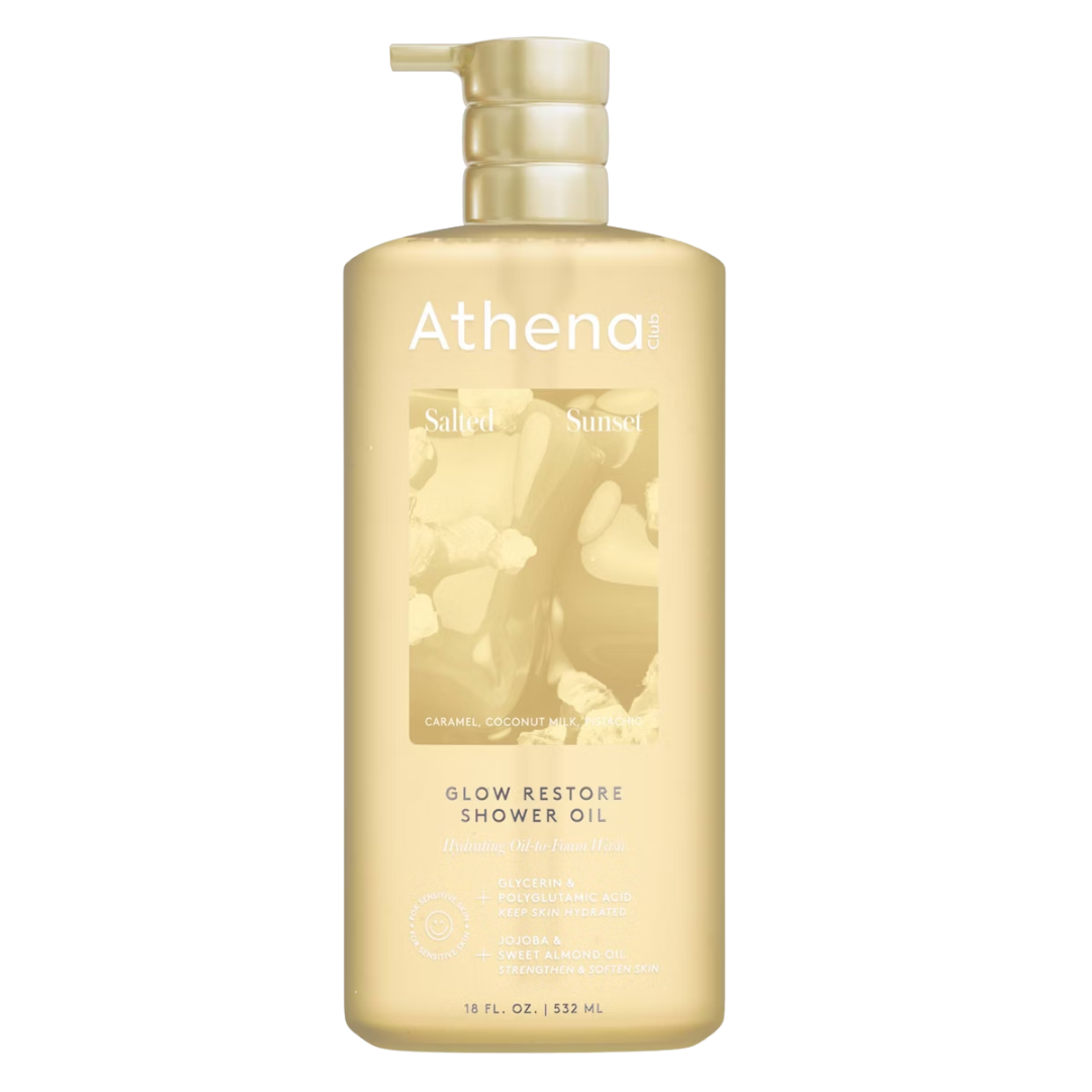 Athena Club Glow Restore Shower Oil in Salted Sunset is a nourishing oil-to-foam body cleanser designed to gently cleanse while deeply hydrating the skin. The silky formula begins as a rich oil that melts into the skin and transforms into a soft, creamy lather that removes impurities without stripping moisture. Powered by a glycerin-rich formula with over 40% glycerin, hydrating polyglutamic acid, and a blend of nourishing oils such as sweet almond, jojoba, argan, and avocado, it helps replenish moisture, support the skin barrier, and leave skin feeling smooth and glow-ready after every shower. The Salted Sunset fragrance adds a warm, tropical touch with sweet, sun-drenched notes that evoke the feeling of a relaxing beachside escape.