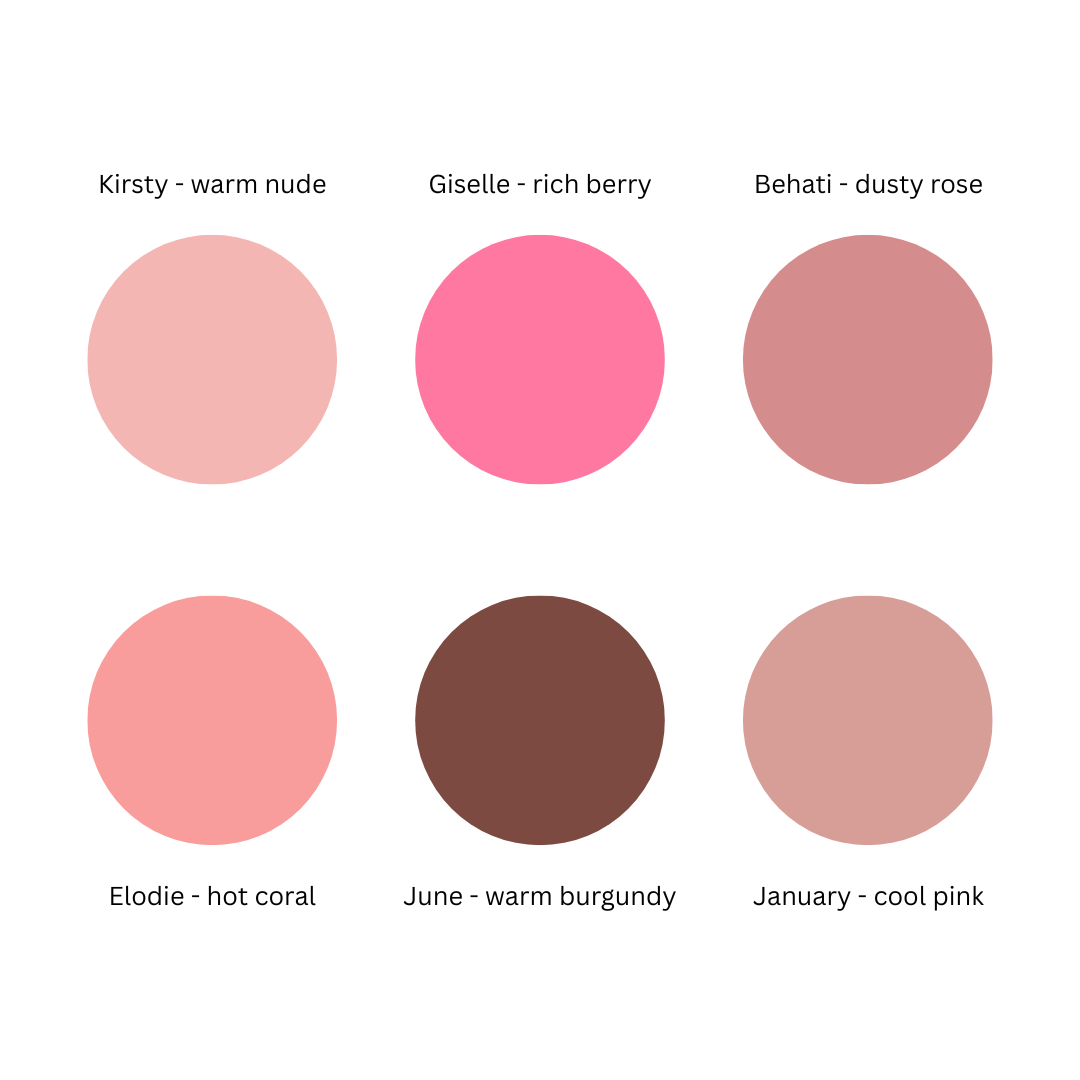 Available shades: | Kirsty – warm nude, Giselle – rich berry, Behati – dusty rose, Elodie – hot coral, June – warm burgundy, January – cool pink |