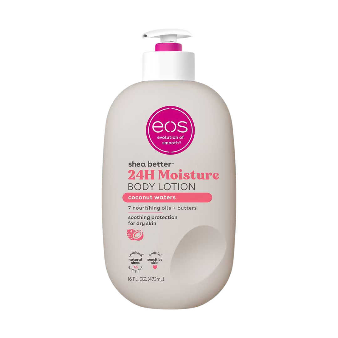 Indulge in long-lasting hydration with eos Shea Better 24H Moisture Body Lotion in Coconut Waters. This rich yet lightweight formula is infused with nourishing shea butter and a blend of natural oils to deeply hydrate and replenish your skin. The Coconut Waters scent offers a refreshing, tropical fragrance that leaves your skin feeling soft, smooth, and delicately scented. Designed for all-day moisture, it provides 24-hour hydration, keeping your skin feeling nourished and silky without any greasy residue. Perfect for everyday use, this 16 fl oz lotion is ideal for all skin types.