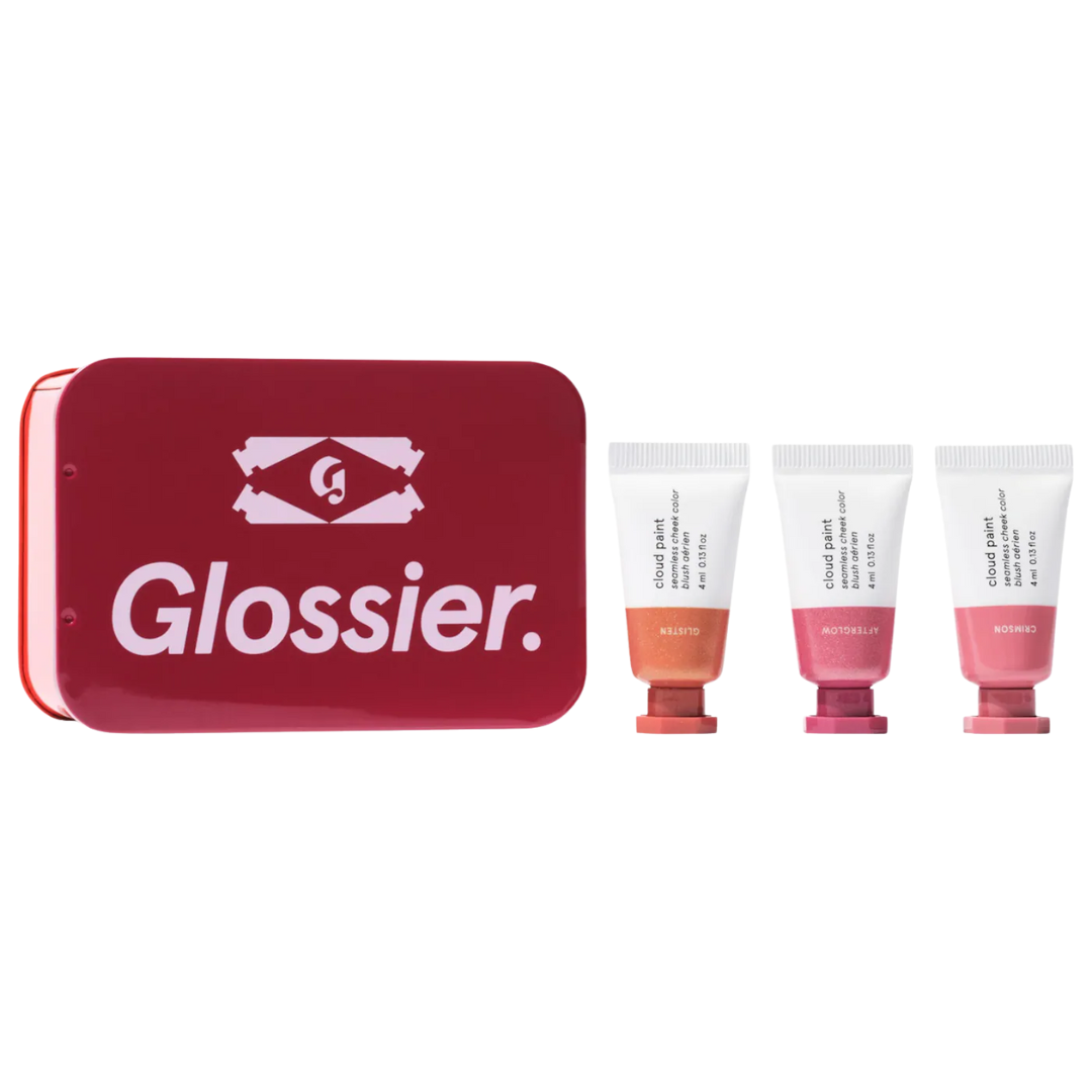 Brand: GlossierBring a flush of effortless color to your cheeks with the Mini Cloud Paint Blush Trio from Glossier. This limited-edition set features three pocket-sized shades—Crimson, Glisten, and Afterglow—all in the iconic gel-cream formula that blends seamlessly for a soft, natural finish. The lightweight texture melts into the skin, making it easy to build from a sheer wash of color to a more vibrant look.