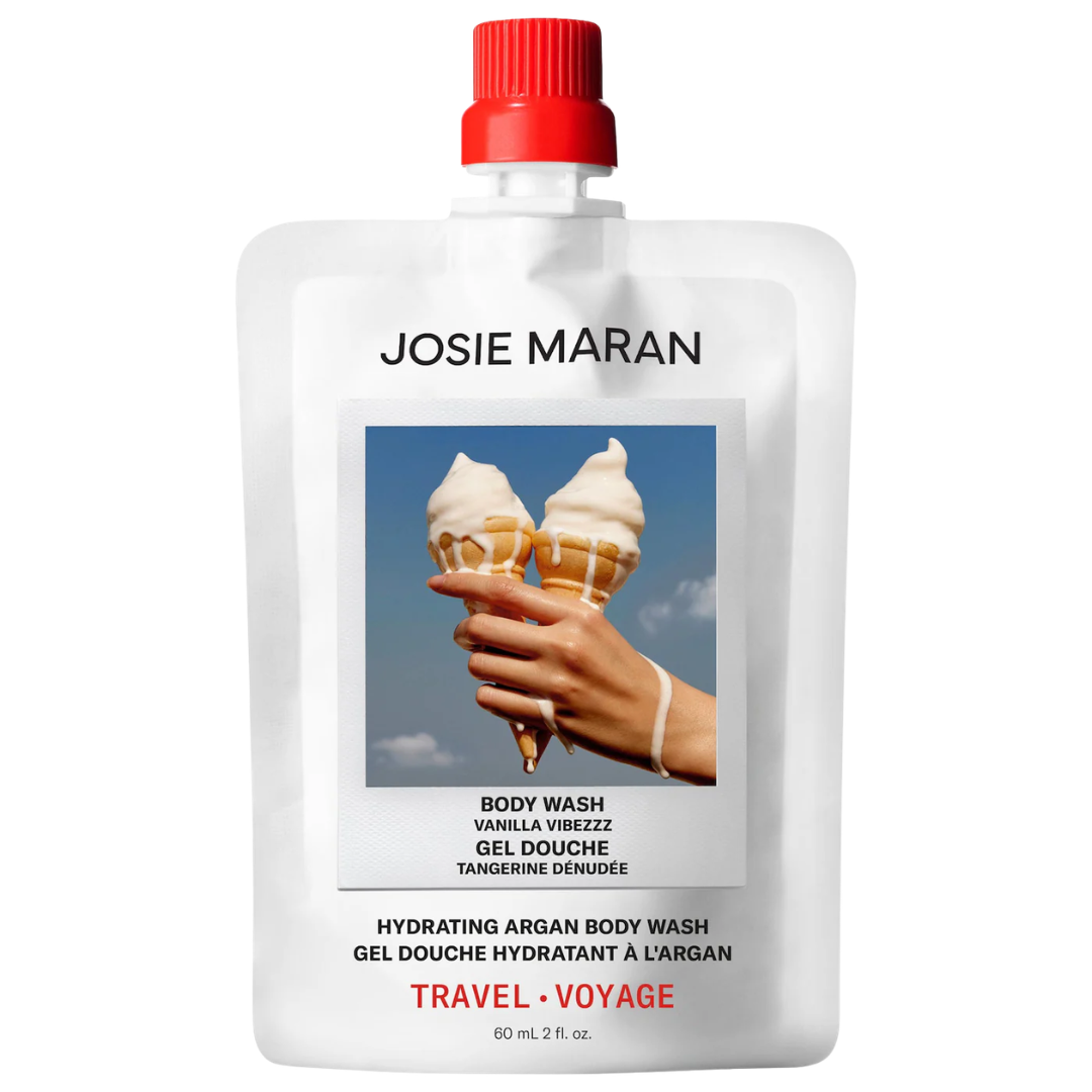 JOSIE MARAN Vanilla Vibezzz Hydrating + Cleansing Argan Refillable Body Wash Mini is a travel-friendly body cleanser designed to gently cleanse while delivering lasting hydration. Infused with the brand’s signature 100% pure argan oil, nourishing amino acids, and coconut-derived cleansing agents, it creates a creamy, bubbly lather that removes impurities without stripping the skin. The formula is clinically shown to help keep skin hydrated for up to 24 hours after use while leaving it soft, smooth, and comfortable. The Vanilla Vibezzz fragrance blends creamy vanilla with sparkling bergamot and warm cedarwood, creating a sweet yet sophisticated scent that lingers subtly after showering.