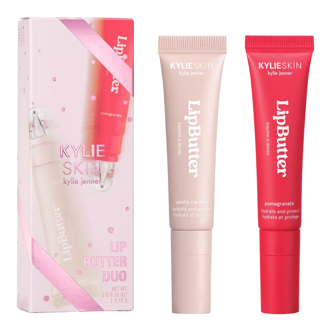 Brand: Kylie CosmeticsPamper your lips with the Kylie Skin Lip Butter Duo Gift Set from Kylie Cosmetics. This limited-edition set features two ultra-nourishing lip butters: the best-selling Clear Vanilla Caramel scent and the NEW Pomegranate shade—a sheer red tint with a fruity twist. Each balm is infused with moisturizing ingredients to keep lips soft, smooth, and hydrated with a glossy, non-sticky finish.