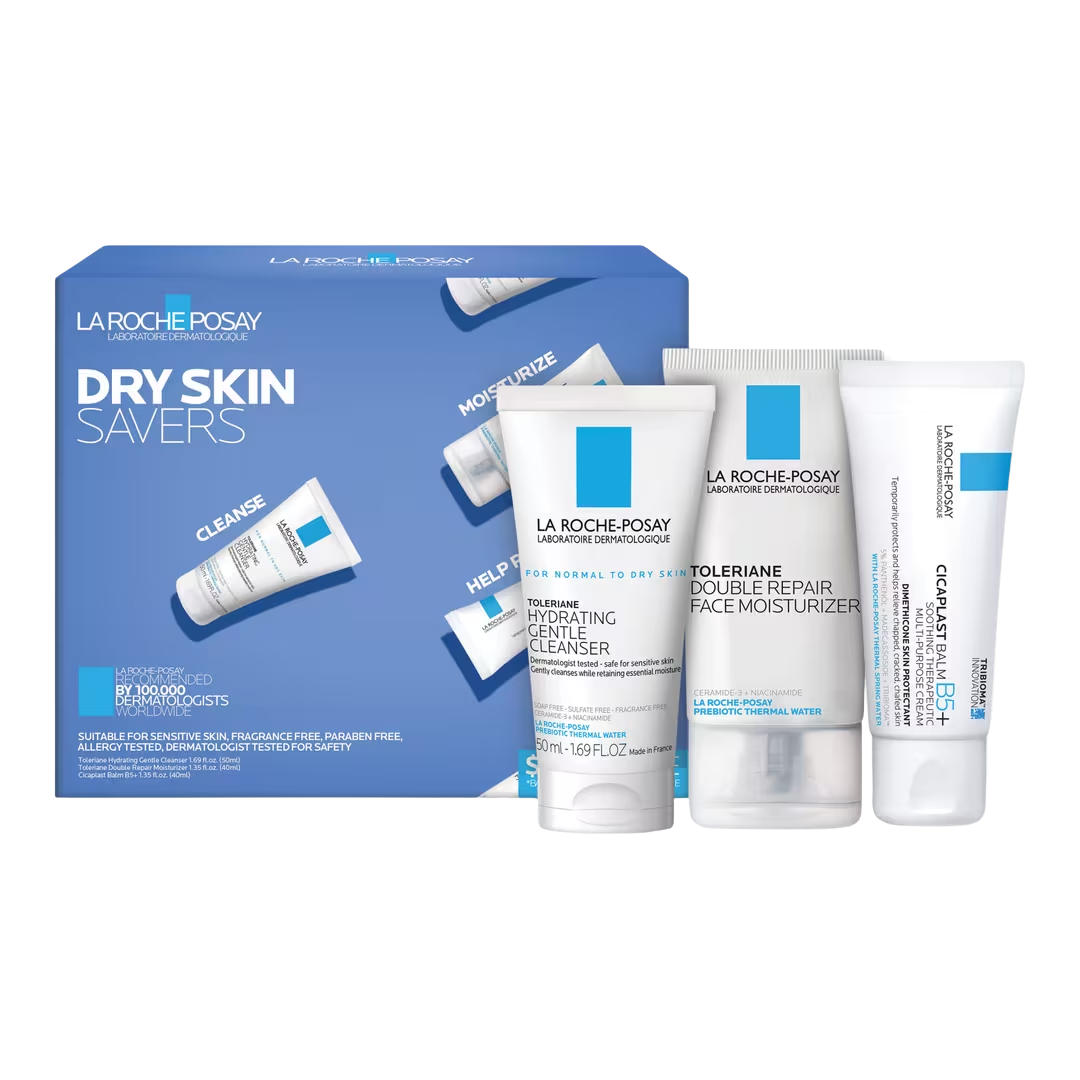 Brand: La Roche-PosayGive your skin the ultimate hydration and protection with the Dry Skin Savers Set from La Roche-Posay. This trio is specially formulated to soothe, repair, and hydrate dry, sensitive skin from head to toe. The Toleriane Hydrating Gentle Face Cleanser (1.69 oz) gently removes dirt, makeup, and impurities while maintaining your skin’s natural moisture barrier and pH balance. The Toleriane Double Repair Face Moisturizer (1.35 oz) repairs your skin’s protective barrier within one hour and delivers up to 48 hours of hydration. The Cicaplast Balm B5+ (1.35 oz) is a multi-purpose soothing cream for dry, chapped, or irritated skin; non-greasy and protective, it relieves rough skin while shielding it from environmental stressors like wind and cold.