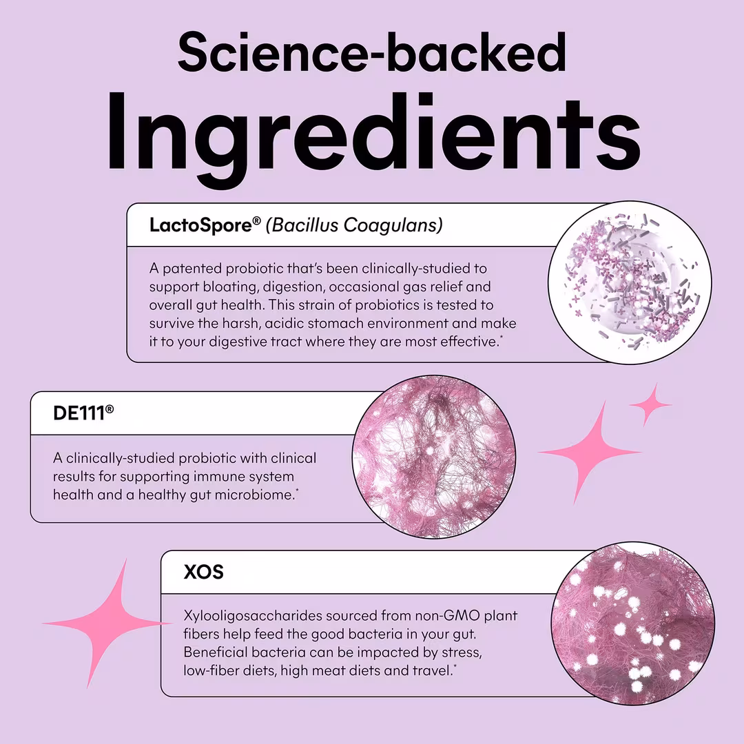 Digestive Probiotic Blend (Bacillus coagulans (MTCC 5856 LactoSpore®), Bacillus subtilis (DE111®)), DigeSEB® Enzyme Blend (Amylase, Lactase, Lipase, Cellulase and Protease), Xyooligosaccharides (Prebiotic XOS), Other Ingredients: Nu-RICE® Organic Rice Bran Extract, Hypromellose Capsule, Nu-MAG Organic Rice Extract, Nu-FLOW® Organic Rice Hulls.