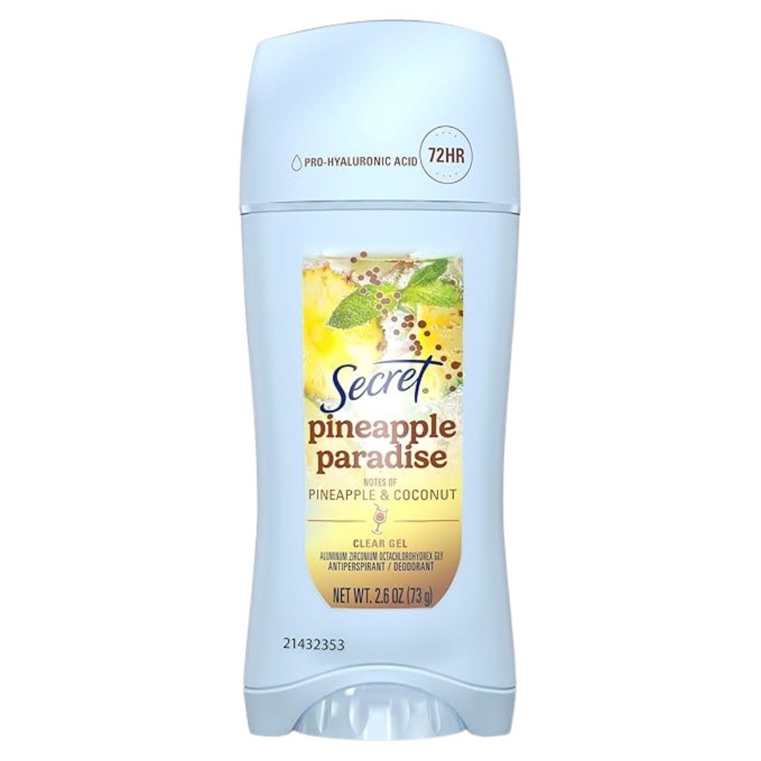The Secret Fresh Antiperspirant Deodorant in Pineapple Paradise is a clear gel formula designed for daily use. Antiperspirant deodorants of this type are typically applied to underarms to help reduce wetness and provide long-lasting freshness throughout the day.